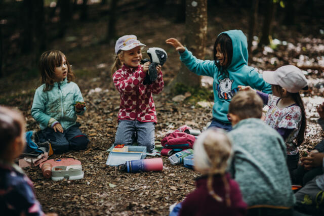 Vor dem Essen werden die Kinder ruhig und lauschen auf die Töne des Waldes. Wir warten bis alle sitzen und ausgepackt haben. Gemeinschaft und gegenseitige Rücksichtnahme ist uns sehr wichtig. Deshalb beginnen wir die Brotzeit mit dem Ritual des Brotzeitspruches und beenden sie, wenn alle fertig sind, indem die Kinder selbständig einpacken und fragen, ob sie aufstehen dürfen. In der Brotzeitrunde ist Zeit für Gespräche, Entspannung und kleine Vorlese- oder Märchenrunden.